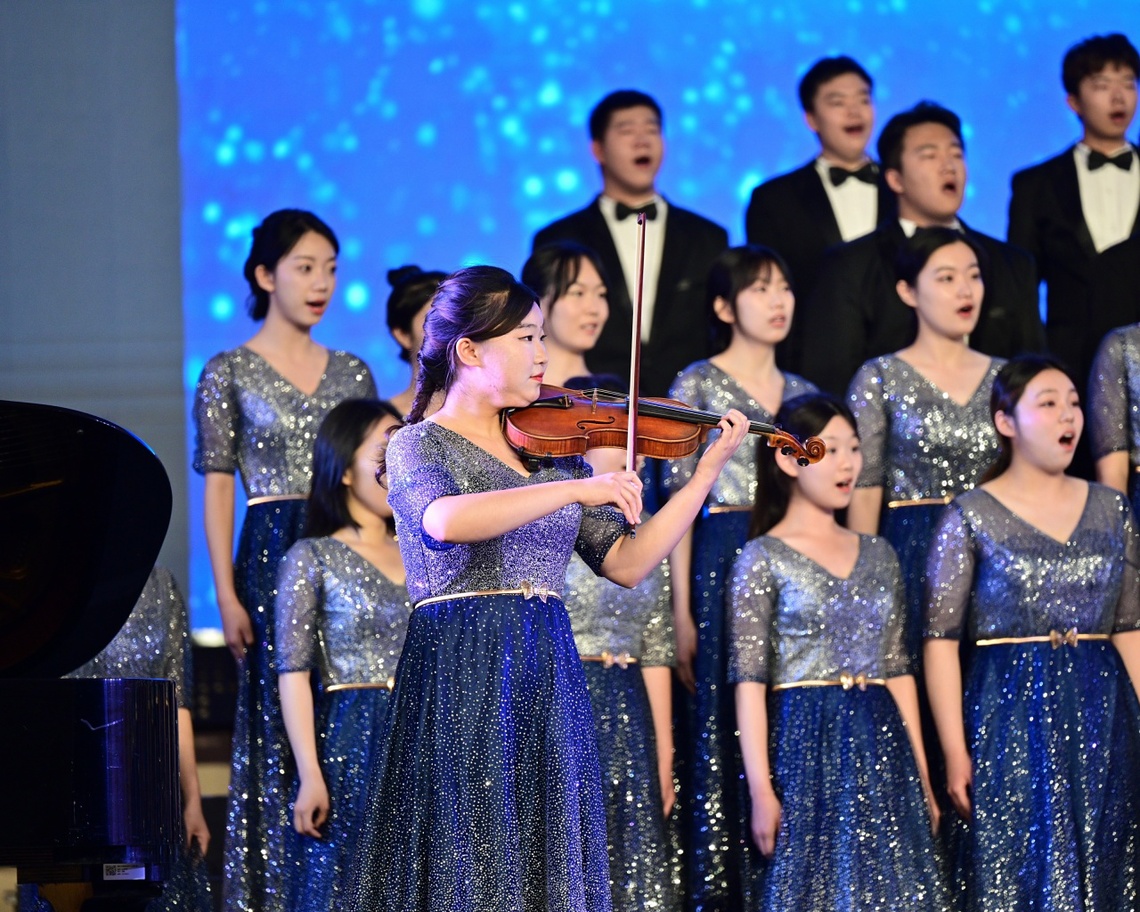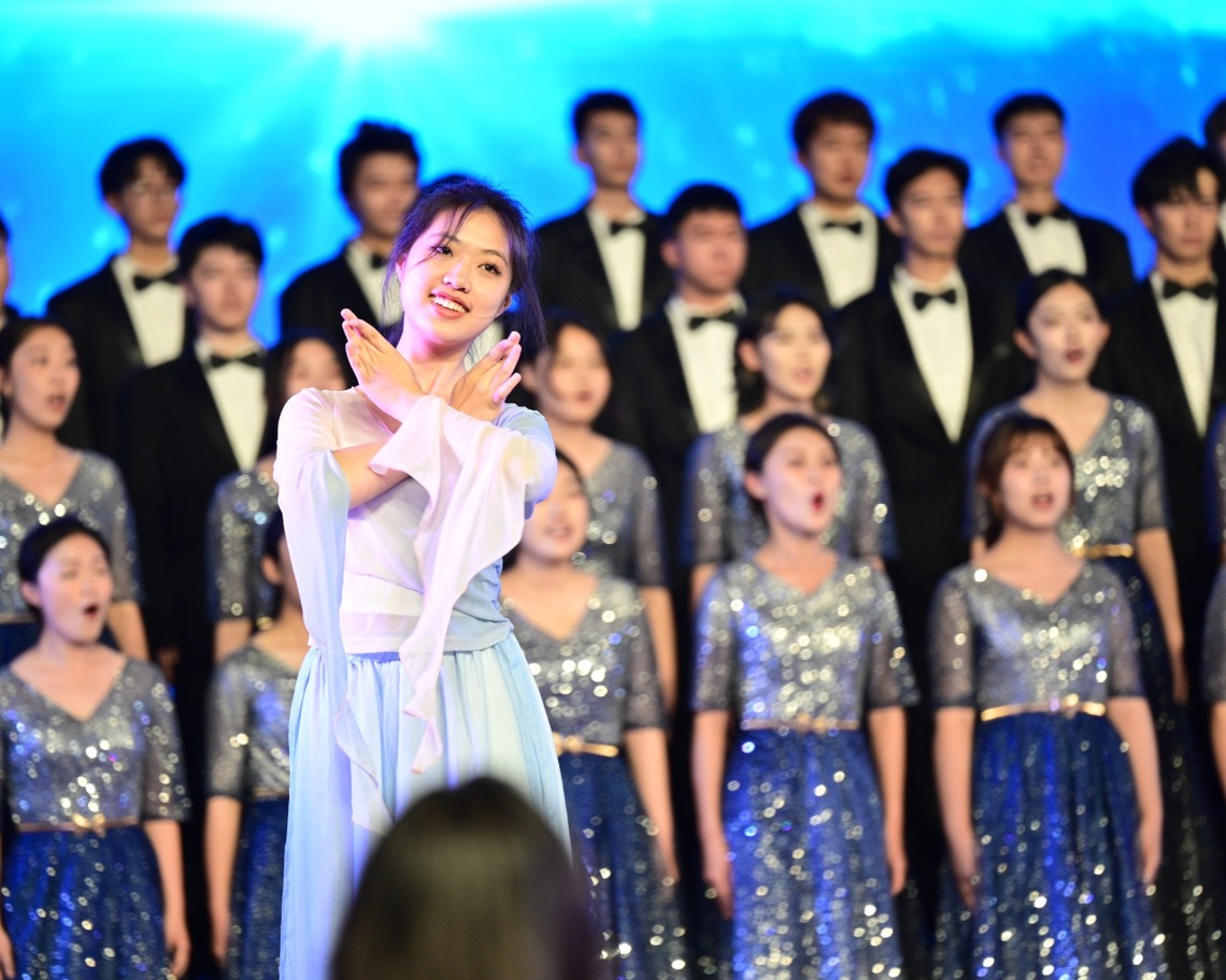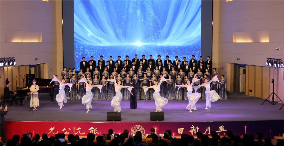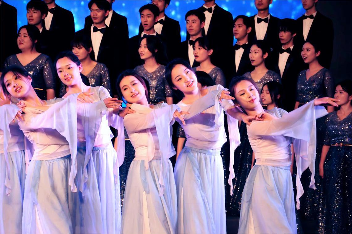 金融学子身着蔚蓝礼服,四个声部在指挥、钢伴、小提琴、舞蹈、音束的默契配合下,朝气蓬勃,以嘹亮的歌声歌颂青春,礼赞祖国。“飞扬,飞扬”,优美的韵律仿佛化作漫天飞舞的雪花,飘扬在祖国辽阔的大地上,描摹出天地间崇高的画卷。以激昂之声,彰显着南开金融青年的风采与活力,赢得满堂喝彩。