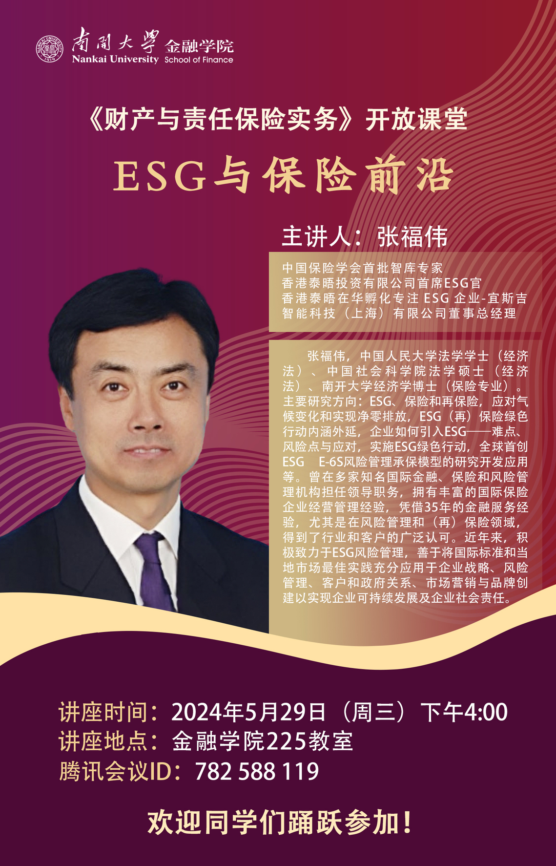 张福伟,中国人民大学法学学士(经济法)、中国社会科学院法学硕士(经济法)、bw必威西汉姆联官网经济学博士(保险专业)。主要研究方向:ESG、保险和再保险,应对气候变化和实现净零排放,ESG(再)保险绿色行动内涵外延,企业如何引入ESG——难点、风险点与应对,实施ESG绿色行动,全球首创ESG E-6S风险管理承保模型的研究开发应用等。曾在多家知名国际金融、保险和风险管理机构担任领导职务,拥有丰富的国际保险企业经营管理经验,凭借35年的金融服务经验,尤其是在风险管理和(再)保险领域,得到了行业和客户的广泛认可。近年来,积极致力于ESG风险管理,善于将国际标准和当地市场最佳实践充分应用于企业战略、风险管理、客户和政府关系、市场营销与品牌创建以实现企业可持续发展及企业社会责任。