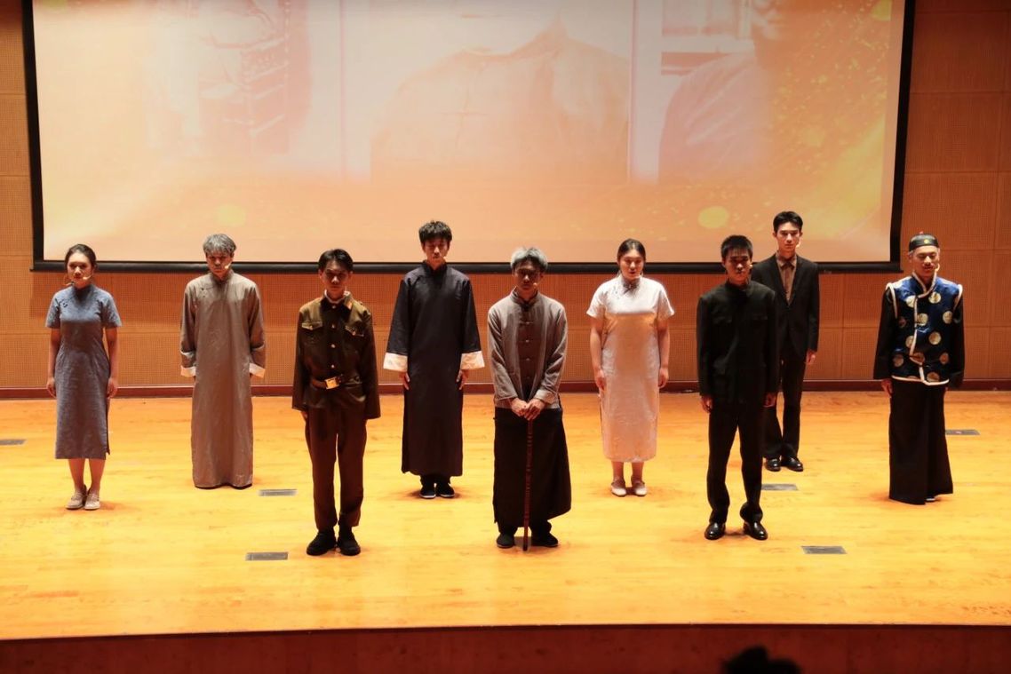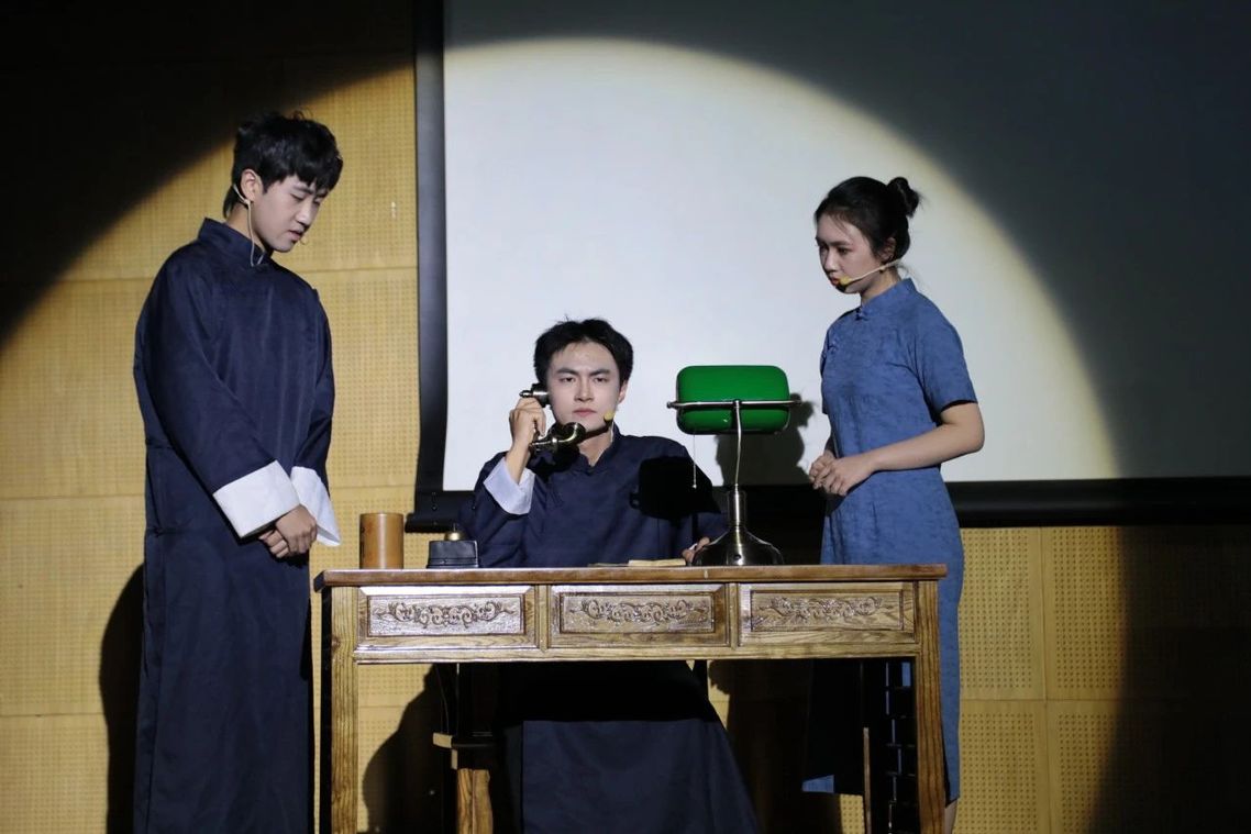 话剧采用倒叙的形式展现,在急促的电话铃声、轰炸声、炮火声中拉开帷幕——威海卫战败,国帜三易,他毅然决定弃武从教;