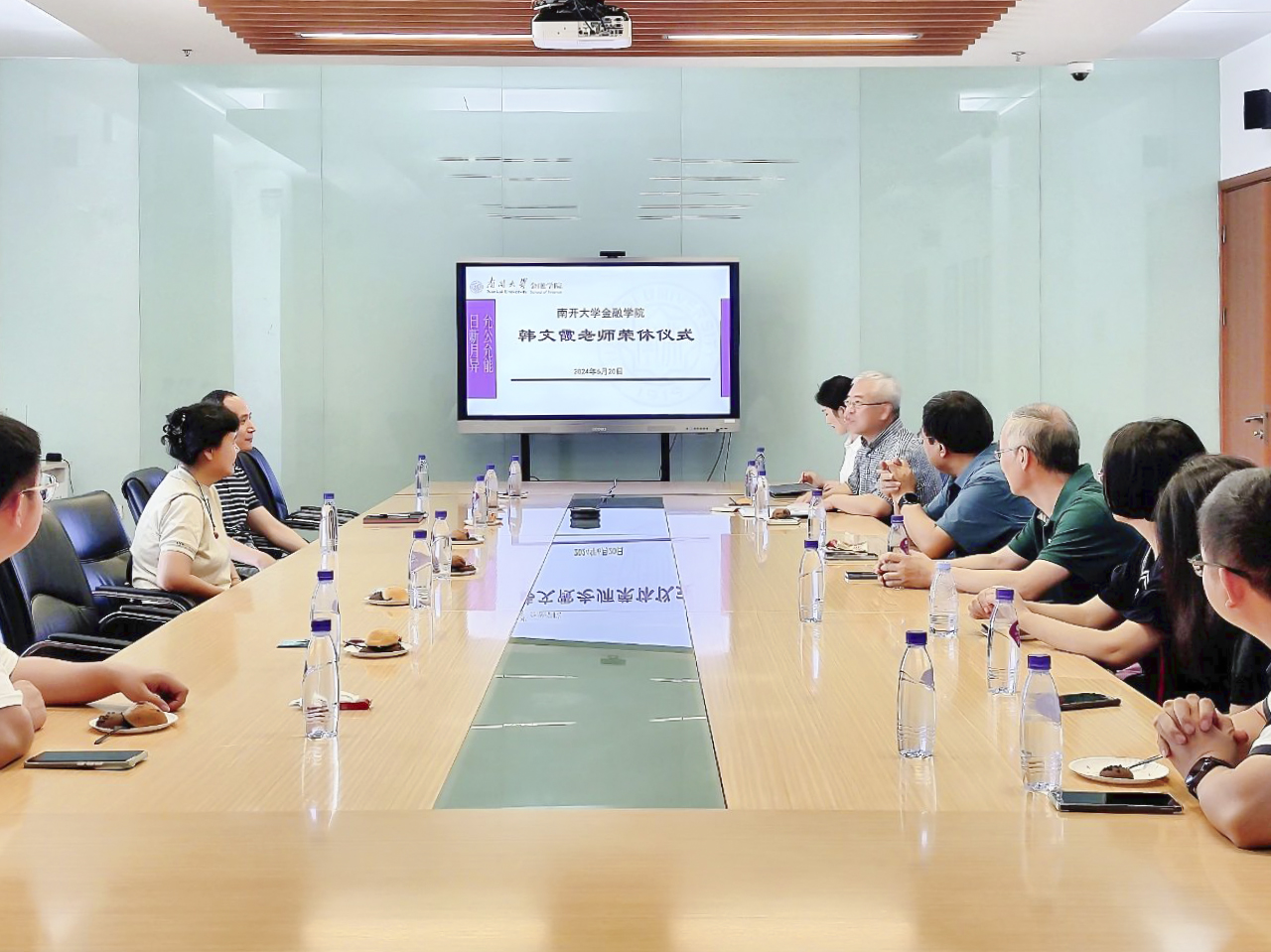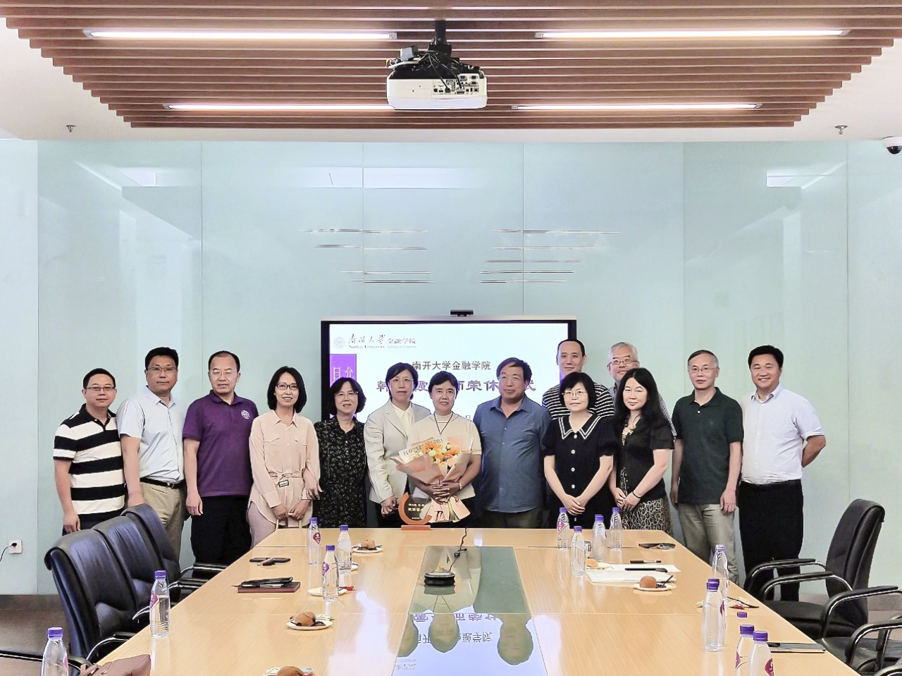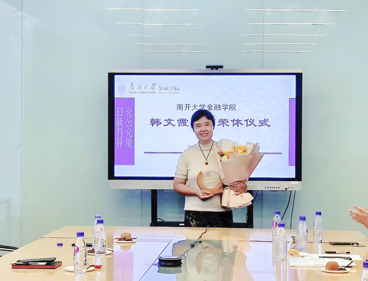 张尧和范小云代表学院向韩文霞老师多年的无私奉献、兢兢业业的工作态度,以及为南开国际金融等方向的发展和学院建设做出的贡献表示衷心的感谢,祝愿韩老师在新的阶段开启人生新篇章,并诚挚邀请韩老师继续为学院发展建言献策。
