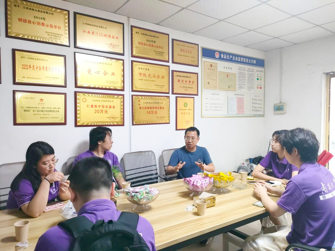 在江西杨岐山食品有限公司,实践队在公司负责人的带领下参观了公司厂房和栽种的山枣树,了解了公司负责人将企业由花炮生产转型为食品加工的原因、公司的发展现状和遇到的问题。通过交流,实践队员们了解到公司从2017年就开始推进配方研制、定制产线、原料获取、销售渠道打通等多项工作,于2018年正式投入生产销售,目前公司产品已销往我国沿海大部分地区,并已开通线上销售渠道。