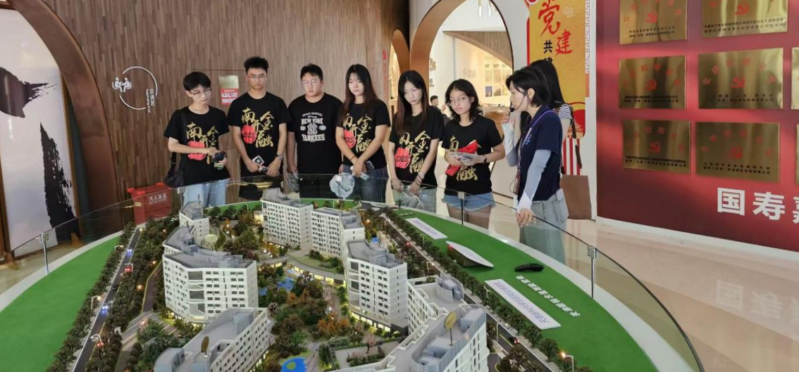 次日,陈孝伟教授带领实践队参观走访了天津国寿嘉园养老社区。首先,工作人员围绕社区建筑沙盘模型向师生介绍了国寿嘉园的概况与优势,天津国寿嘉园配套设施成熟、全面,并实现了津城主城区半小时、京冀一小时交通圈,社区内合作成立中西医结合特色医院——北门乐境医院,不仅具有得天独厚的地理优势,而且具备优质医疗健管资源。随后,师生一行人参观了餐厅、暖廊等基础设施与活力生活区社团活动展示角以及文化休闲设施,工作人员介绍养老社区服务内容包括生活照料、健康关怀、文化娱乐、社交活动等,旨在满足长者“吃、住、医、护、乐、学、游”等多样化养老需求。