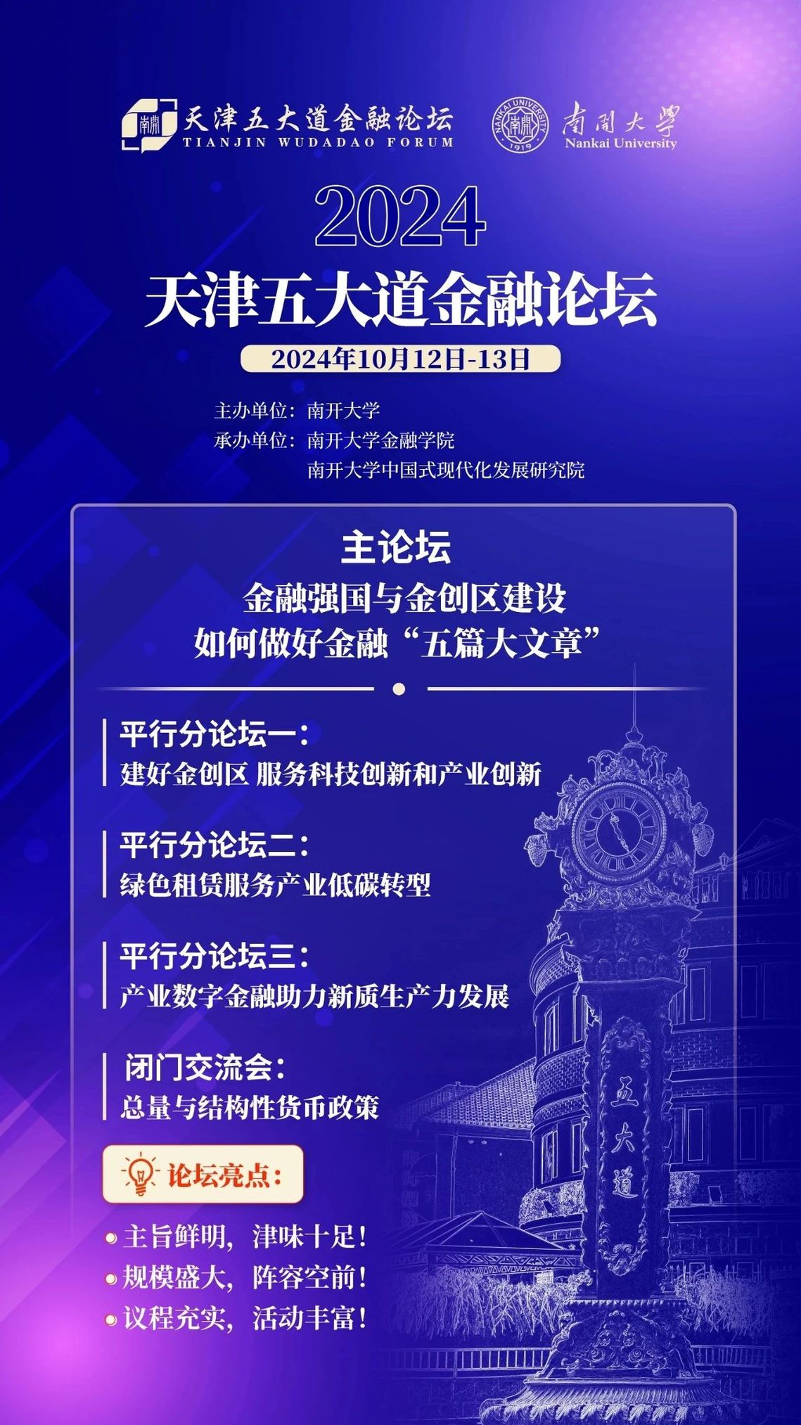 10月13日,业内翘首以盼的一场高水准金融论坛——2024天津五大道金融论坛将如约而至。届时,来自国家部委、知名高校、权威智库及全球领先金融机构约350名杰出代表将共聚天津,以“金融强国与金创区建设”为主题,围绕“如何做好金融‘五篇大文章’”碰撞思想、探索路径,助推天津金创区高水平建设。
