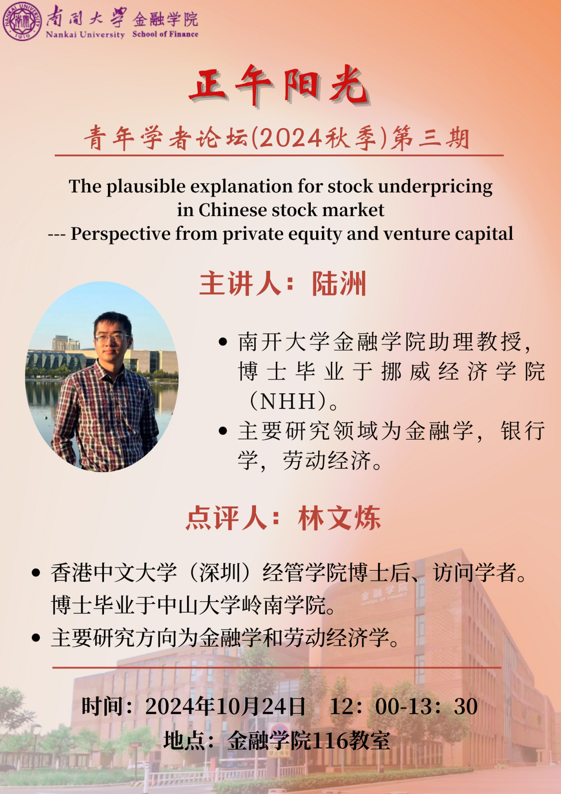 讲座题目:The plausible explanation for stock underpricing in Chinese stock market --- Perspective from private equity and venture capital