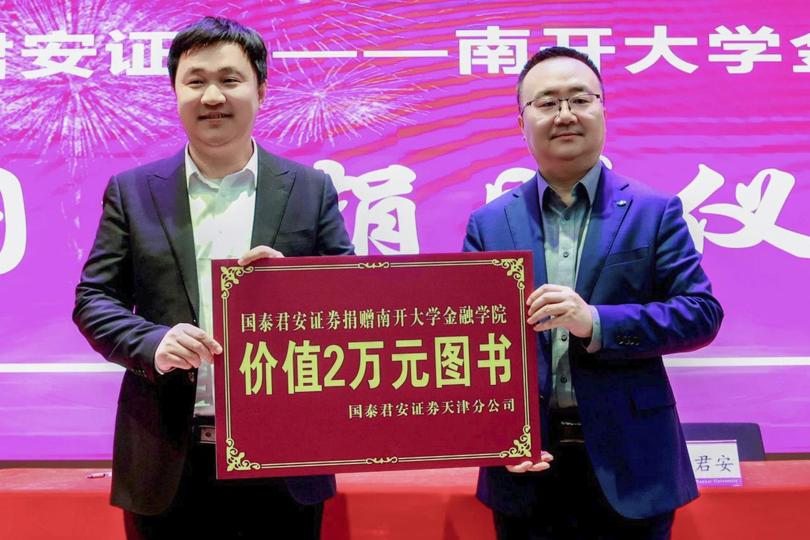 为进一步推动学院人才培养和学风建设,为员工营造良好的学习环境,国泰君安天津分公司向学院“宁一弘道书斋”捐赠价值两万元的系列图书,betway88西汉姆联副经理王越超与国泰君安证券天津分公司总经理助理邓云共同签署捐赠协议、授捐赠牌。