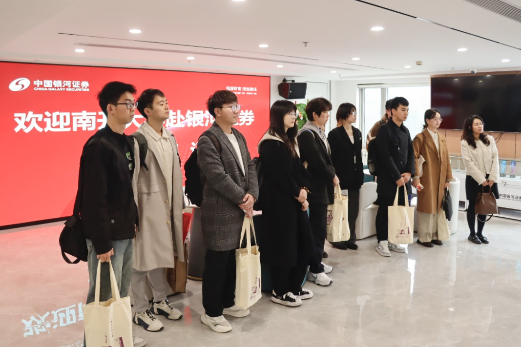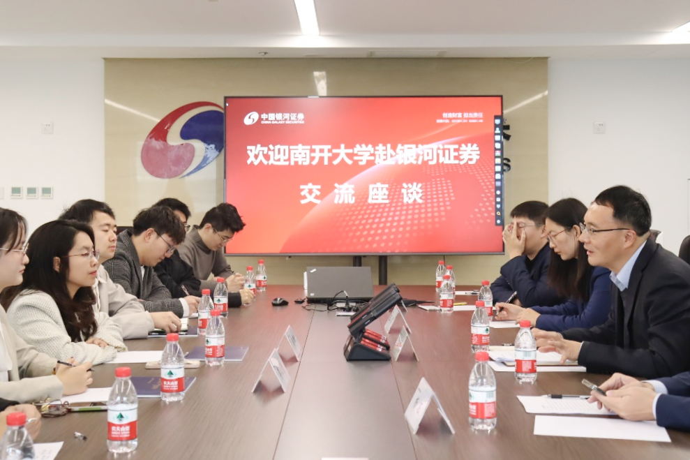 师生一行首先来到银河证券金融街营业部。副总经理吕剑、财富管理一部总监杨旺、综合管理部副总监王小琴、财富管理一部理财顾问刘桦和李娅琳与师生热烈交谈,详细介绍了银河证券的发展历程、组织架构、业务布局、党建工作、投资者权益保护、员工培养体系等基本情况,双方还围绕行业现状和发展方向、企业招聘需求等方面开展了深入交流。师生们参观了柜台业务区域和“党建墙”,深入了解证券公司的日常运营情况以及基层党建工作的开展情况和发展成果。
