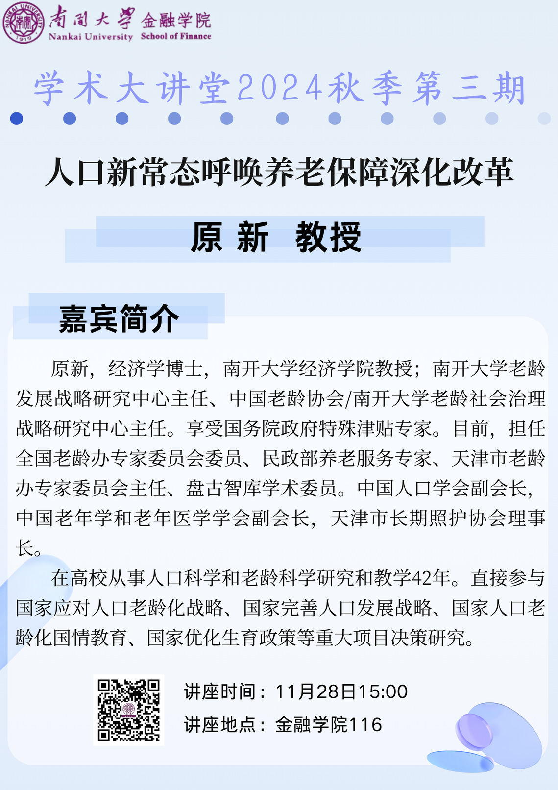 讲座题目:人口新常态呼唤养老保障深化改革