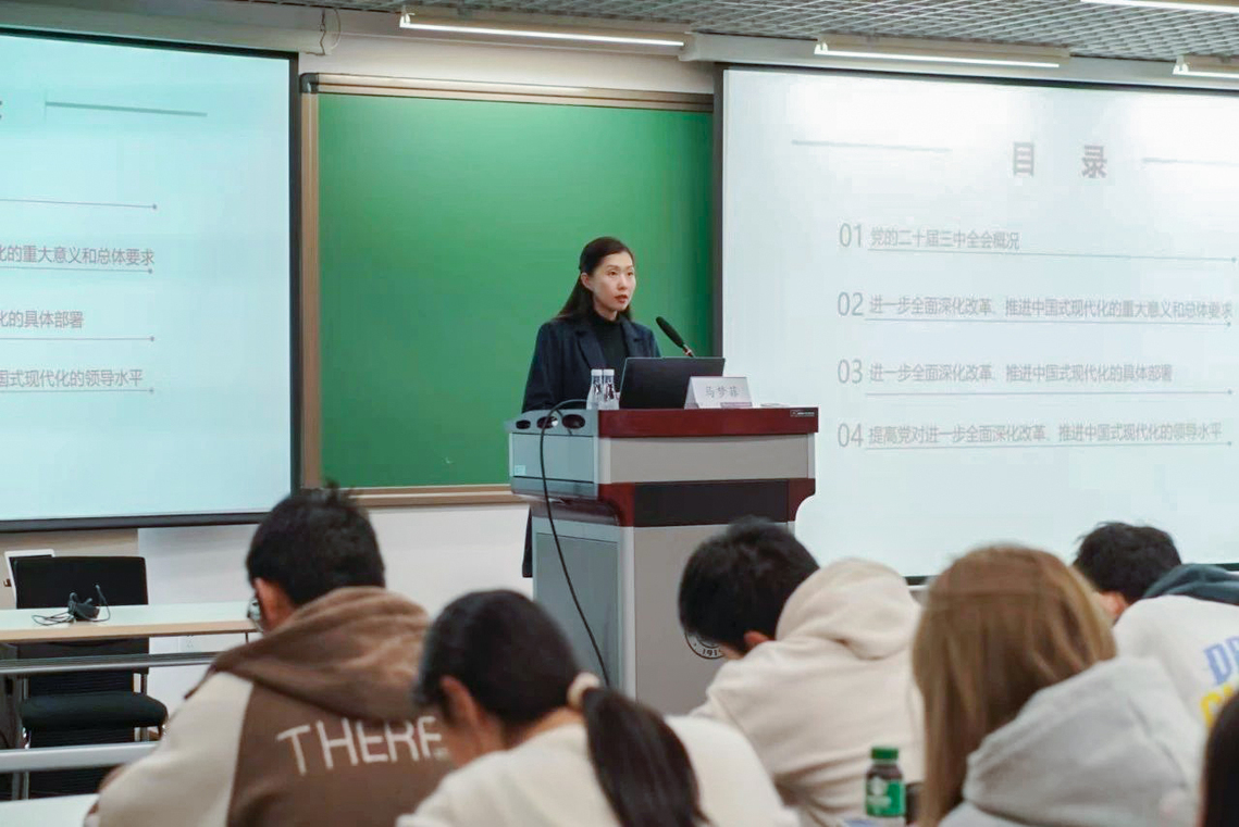通过现场提问,马梦菲引导同学们思考为什么要进行改革,并深入解读了《中共中央关于进一步全面深化改革、推进中国式现代化若干重大问题的决定》,从进一步全面深化改革的重要性和必要性、进一步全面深化改革的指导思想、进一步全面深化改革的总目标、进一步全面深化改革的原则四个层面进行展开阐述。