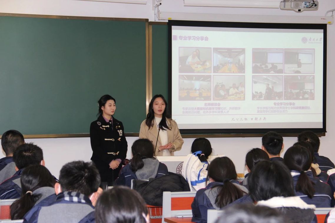 随后,青年海归教师张晓琳助理教授详细地介绍了学院整体情况、团队力量、特色班设置以及招生具体政策等内容,为建平中学的同学们提供了全面且准确的参考。在读员工代表凌清怡和高妍从自身学习生活角度,分享课业学习、竞赛科研、社会实践以及员工工作参与情况等真实经历,展现了南开金融丰富的校园生活和全面发展的培养模式。