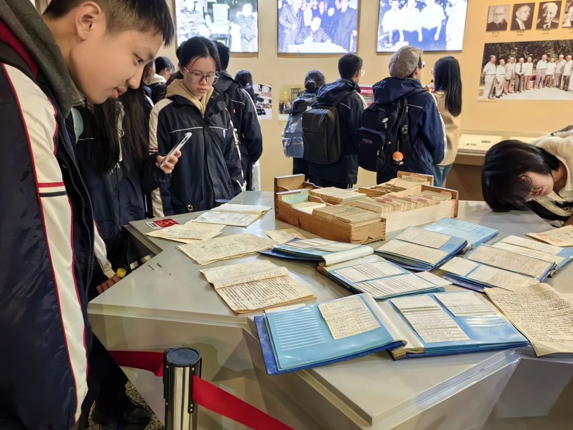 随后,师生们参观宁一弘道书斋。在讲解员的引导下,建平中学的同学们认真聆听讲解,并纷纷寻找并阅读感兴趣的书籍,当场即津津有味地“沉浸式”阅读、讨论起来,为学院浓厚的学术氛围增添一份活力。