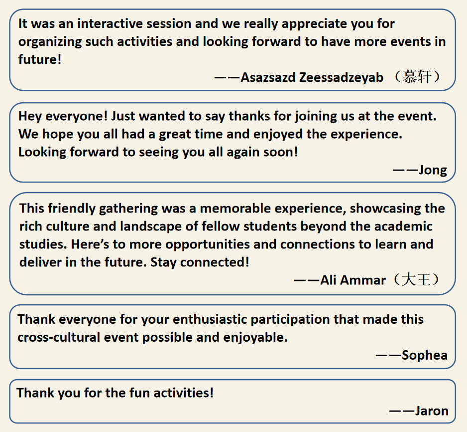 通过本次活动,中国员工锻炼了语言能力,拓宽了国际视野,增强了对多元文化的敏感性和包容心。国际员工也得以提升中文能力,结识了真诚友好的中国朋友,感受到“异国似吾乡,冬日心向阳”的温暖归属感。活动结束后,多位同学表示希望未来能够参与更多类似活动,进一步深化跨文化理解与友谊。