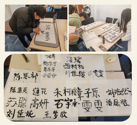 活动以毛笔签到拉开序幕。参与者手执兼毫浸染墨汁,在素白生宣上翻飞起舞。尽管对书法不太熟悉,大家仍然认真地书写,表达对这一传统文化的尊重与热爱。