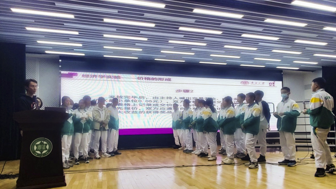 随后,融通人才基地宣讲团的陈一诺和李佳韵两位同学结合生活中的实际案例,分别进行“走进经济学”和“金融保险知识初探”的科普分享。陈一诺从经济学的起源讲起,解释了经济学如何帮助人们理解和解决资源分配的问题,并通过具体的经济学互动实验——价格的形成,让同学们亲身体验了市场机制下资源的合理配置和价格波动的影响。李佳韵则深入浅出地讲解了金融保险学科的基础知识,包括理财的重要性和风险管理的策略。两位同学的生动讲述不仅让高中生们对经济学和金融保险学科有了更加深入的认识,也激发了同学们对学术知识的浓厚兴趣与探索欲望。
