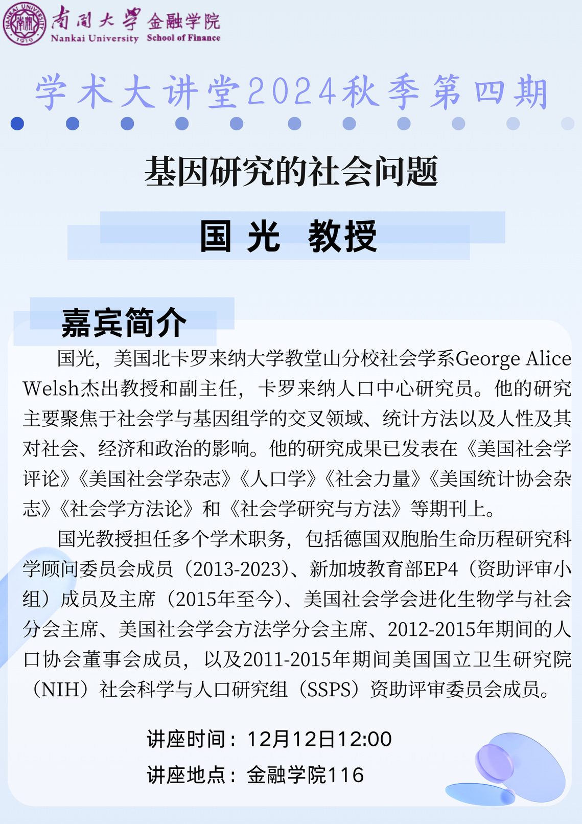 国光,美国北卡罗来纳大学教堂山分校社会学系George Alice Welsh杰出教授和副主任,卡罗来纳人口中心研究员。他的研究主要聚焦于社会学与基因组学的交叉领域、统计方法以及人性及其对社会、经济和政治的影响。他的研究成果已发表在《美国社会学评论》《美国社会学杂志》《人口学》《社会力量》《美国统计协会杂志》《社会学方法论》和《社会学研究与方法》等期刊上。
