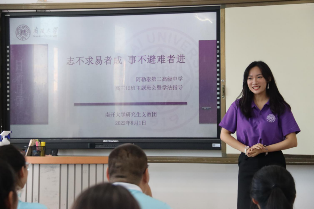阿勒泰支教的经历与收获激励着王晓萌在重返南开校园后,又积极投身到连续四届研究生支教团的培训和选拔工作中。她以“书信寄送”活动为纽带,创新性增进了疆藏甘服务地联动;她结合支教中的经验与思考,精准对接服务地需求,形成了体系化的支教团培训体系。