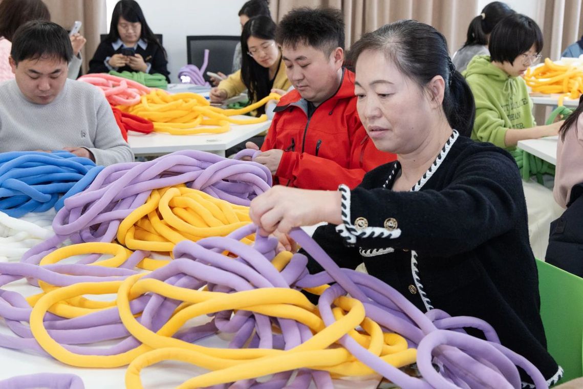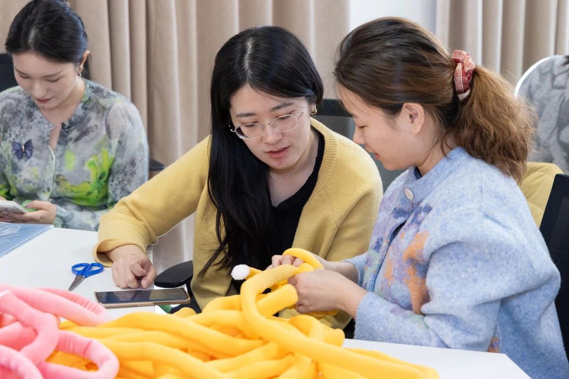 随后,师生们共同体验了冰岛毛线创意编织。蓬松柔软、色彩丰富的冰岛毛线在指尖缠绕,编织出独属自己的多巴胺色彩。现场氛围热烈温馨,教室化身充满互助与灵感的创作工坊, “这里要绕两圈,再穿过去钩住……”“你这个做得很好呀,外面像这样再加一圈就好了……”大家积极交流讨论,分享着编织的心得和乐趣。经过一个小时的努力,大家先后完成了挎包、抱枕、坐垫、猫窝等作品,展现了betway88西汉姆联师生的审美力和创造力。