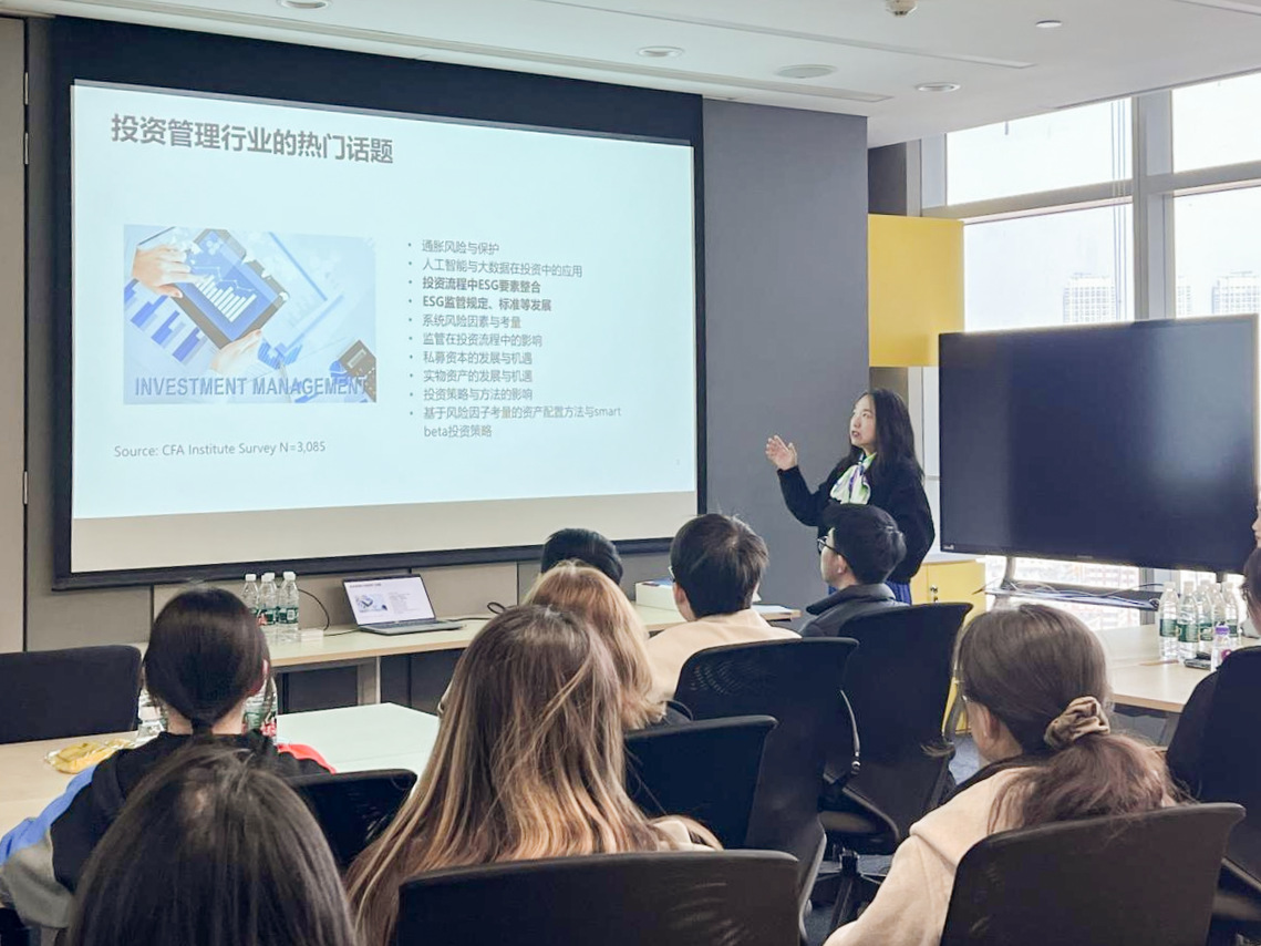 在专题讲座环节, CFA Institute中国区合作伙伴关系及客户解决方案总监吴薇基于CFA问卷调查数据,介绍了资管行业对于公司ESG披露的高度关注,详细阐释了TCFD披露框架的四大支柱,以及该框架对公司财务状况的影响,同时,为在场同学们解读了CFA考试概况及考情。