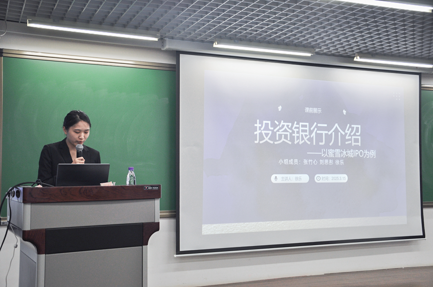 课程中,2022级本科生徐乐以近期备受瞩目的蜜雪冰城上市案例为切入点,生动而具体地描绘了投资银行在首次公开募股(IPO)过程中所扮演的关键角色。互动环节,同学们还积极踊跃地参与了课程讨论,结合“滴滴快的”并购案、美国五次并购浪潮、“9.24并购新政”出台等热点话题,各抒己见,现场交流气氛热烈。