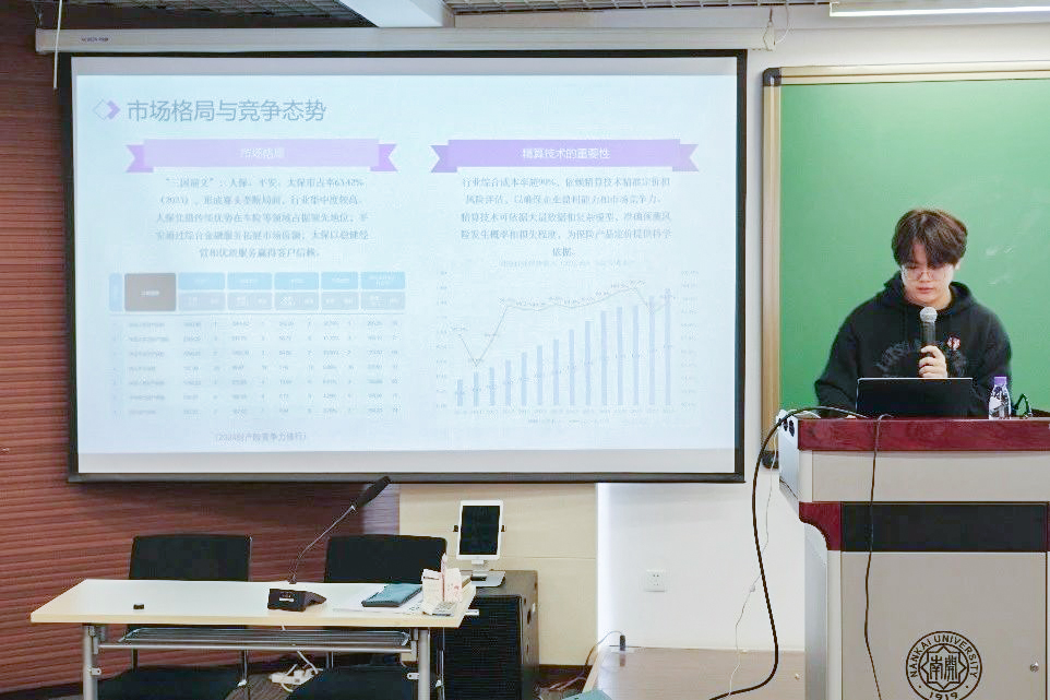 在本次公开课中,2023级本科生娄易凡以“财产保险概览”为主题进行学习展示。他详细阐述了其所在研究小组对财险行业市场规模的现状分析,并深入探讨了行业增长背后的结构性挑战。