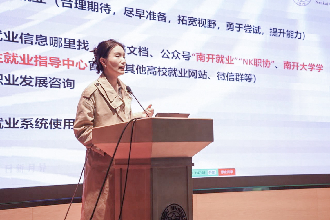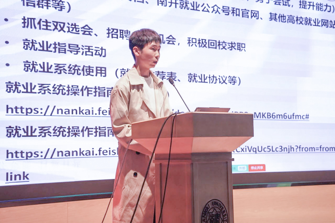段先超首先展示了求职就业、境内升学、境外升学三类毕业去向的准备时间线,结合历年学校就业数据和优秀毕业生案例重点介绍了秋招和春招的区别,以及选调生报考、国际组织实习和应征入伍的相关流程和信息。段先超指导同学们通过主动搜集招聘信息、完善个人简历、锻炼笔试面试能力、利用暑假实习实践和员工资源等提升求职技能,调整求职心态,了解并搜集学校支持政策和天津市就业政策,善用AI简历与面试系统、一对一生涯咨询、校内招聘活动和就业指导活动等校内资源以及多种校内就业平台。最后,鼓励2026届毕业生善用资源、锚定方向,在秋招关键期抢占先机。