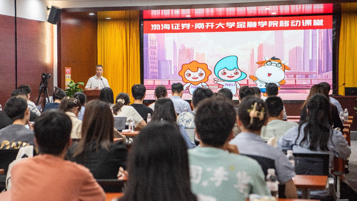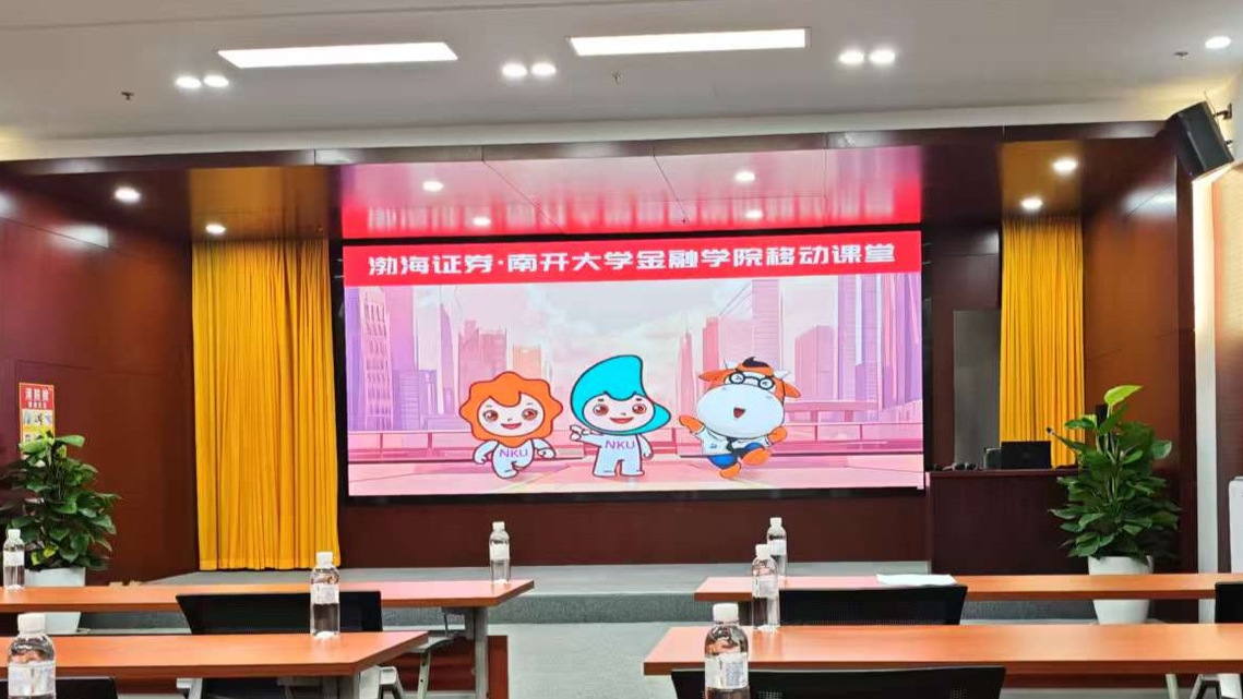 渤海证券对此次移动课堂给予了大力支持。除了安排多位专业人员直接参与课堂,公司还精心设计了欢迎大屏“渤海证券·betway88西汉姆联移动课堂”。大屏中有三个吉祥物,左边两个标注了NKU字样,这是bw必威西汉姆联官网2019年百年校庆时所推出的吉祥物 “阳阳”和“亮亮”,寓意bw必威西汉姆联官网校训“允公允能,日新月异”;右边的吉祥物,是渤海证券的IP形象“嗨牛”,分别与“海”/“HI”、“NEW”谐音,表达公司立足天津、面向全国,走上高质量发展之路的美好寓意。