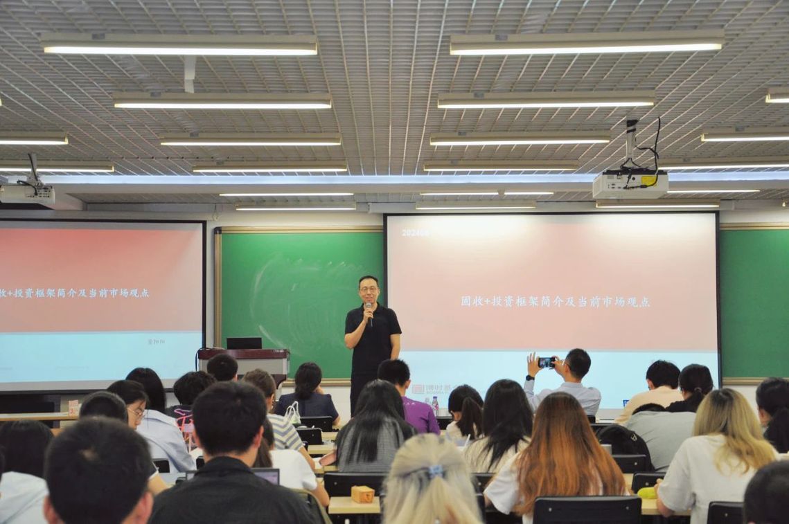 谈及股票定价核心逻辑时,董阳阳提出精妙比喻:将基本面比作“分子”,无风险利率与风险溢价构成“分母”,三者的动态平衡共同决定股价走向。他进一步引导同学们跳出微观个股思维,将整体市场视为“一只股票”,通过宏观指标体系洞察市场全貌,强调“宏观趋势是投资的灵魂”,唯有顺应经济周期大势,方能实现投资回报的指数级跃升,由此鼓励同学们建立宏观视野,密切关注经济发展动态。