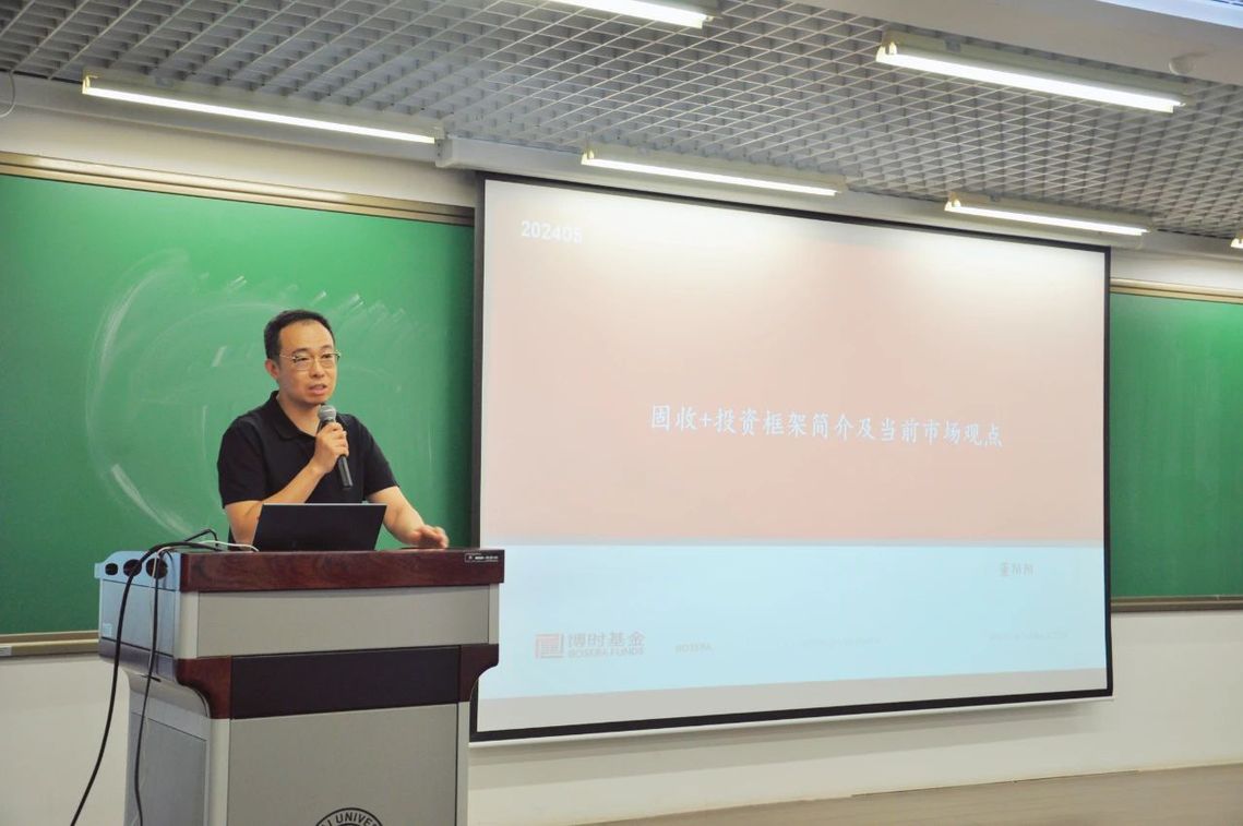 董阳阳以“固收+投资框架简介及当前市场观点”为主题展开分享,首先从资产配置基础理论切入,指出人工智能等新技术正重塑金融市场格局,强调金融从业者需以动态视角适应环境变革,精准把握宏观市场脉络。他以经典的“美林时钟”理论为逻辑起点,结合货币-信用分析框架,深度解构“信用六周期”模型,为师生构建了理解市场运行规律的系统化分析视角。