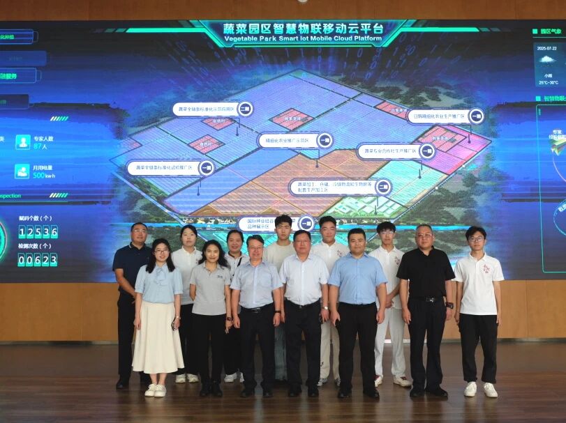 实践队师生实地调研蔬菜园区智慧物联移动云平台,了解工作人员通过小镇物控中心即可对温室墒情的基本数据进行实时监测以及通过温度和水分传感器等设施的应用,使得温度、湿度等数据实时更新,实现了全流程智慧标准化管理等实际工作运行场景。