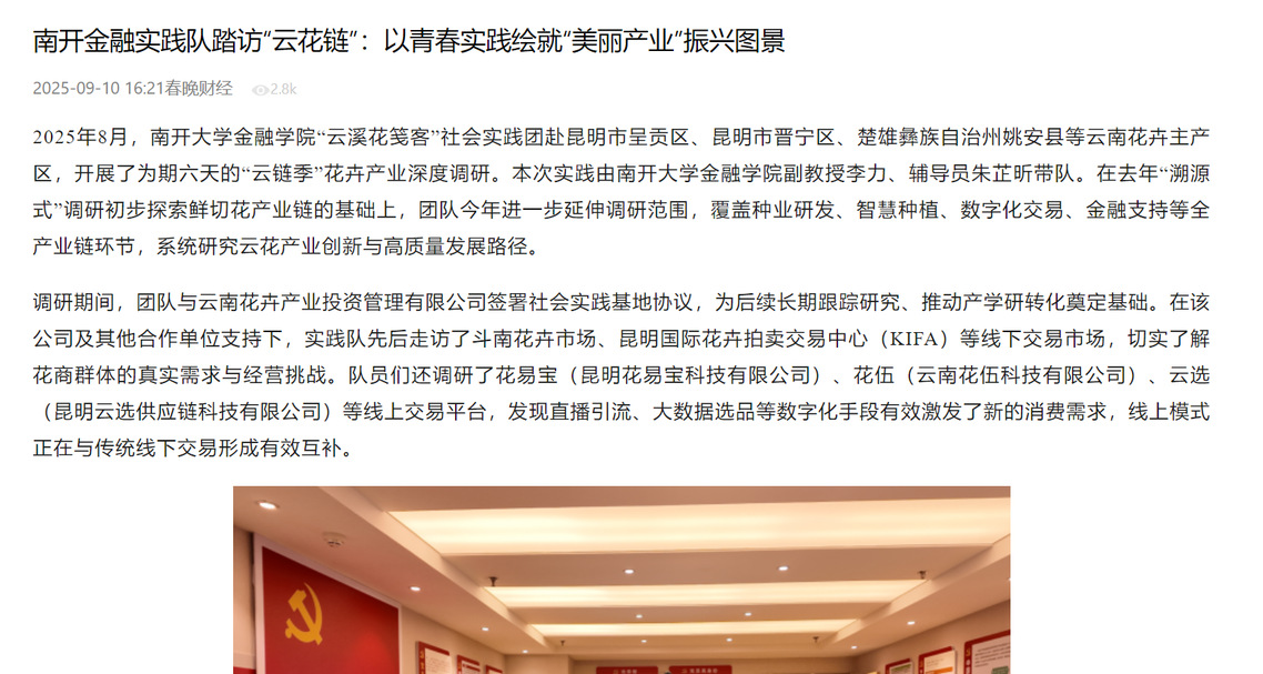 从田间地头到拍卖市场,从移动终端到都市花店,云南花卉正在经历一场深刻的数字化、金融化、品牌化转型。这背后,是政府、企业、花农、金融机构多方协力的成果。未来,实践队将持续跟踪云南花卉产业的发展动态,促进调研成果转化为切实可行的解决方案,助力“云花”馥郁世界,让这一“美丽产业”真正成为带动乡亲增收的“致富产业”、承载乡村振兴梦想的“幸福产业”。