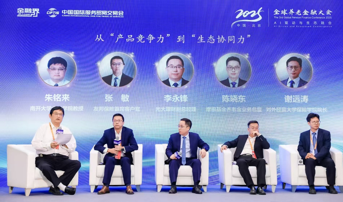 在圆桌对话环节,朱铭来教授作为主持人,与友邦保险首席客户官张敏、光大理财副总经理李永锋、摩根基金养老金业务总监陈晓东、对外经贸大学保险学院经理谢远涛等嘉宾围绕“AI如何赋能生态融合”展开热烈讨论。大家一致认为,养老金融生态应是“开放、融合、普惠、可信”的,银行、保险、基金等机构应合作大于竞争,共同为客户提供“全生命周期+全场景覆盖”的服务体验。