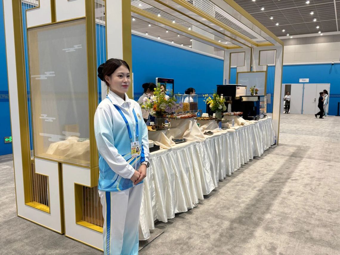“我主要负责新闻中心茶歇区的媒体餐饮服务保障工作,日常需要接待众多外媒记者。当他们有咨询或需要帮助时,我会主动用英语进行沟通交流。