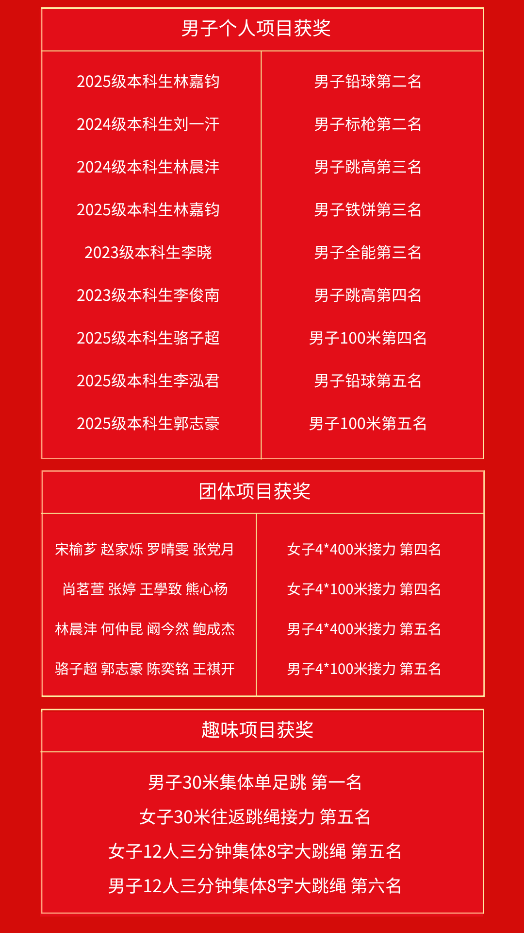 我们,在跑道上气贯长虹,在沙坑前迸发力量,用标枪划出利落的曲线,用身躯跃过崭新的高度……在无数比赛项目中,我们取得佳绩。通过个人拼搏与团队协作,我们挥洒汗水,迸发青春活力,为这份荣耀全力以赴。感谢每一个付出的你,让此次运动会圆满谢幕,这份热血与感动,我们共同珍藏!