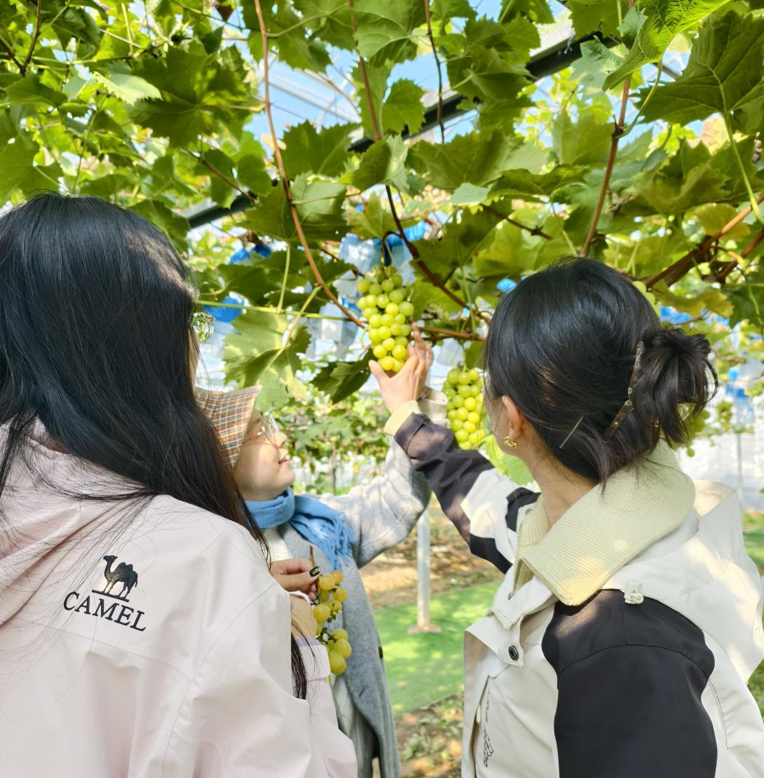 抵达采摘园后,一串串饱满多汁、色泽鲜亮的葡萄挂满枝头,诱人的果香扑面而来。在工作人员的引导下,老师们纷纷走进葡萄园,亲手挑选、采摘心仪的葡萄。大家穿梭在藤蔓之间,时而驻足品尝酸甜可口的果实,时而相互分享采摘技巧,欢声笑语弥漫在田间地头。采摘结束后,大家还体验了亲手榨葡萄汁的乐趣,新鲜压榨的果汁清甜爽口,让人感受到了劳作与收获的双重喜悦。
