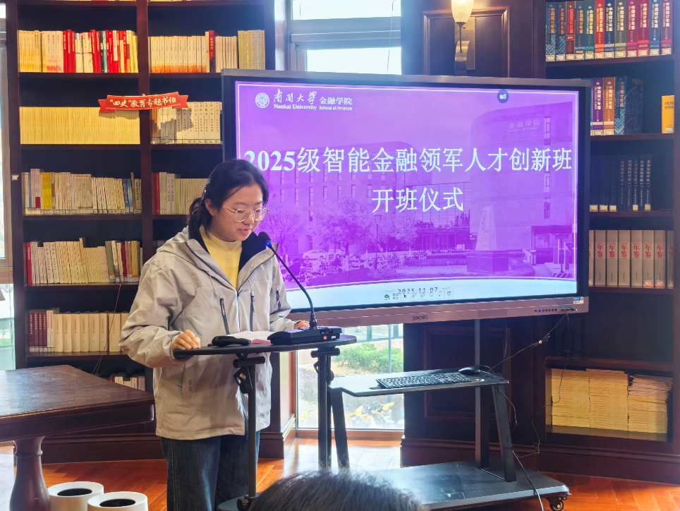 2025级智能金融领军人才创新班员工代表岳紫涵在发言中表示,将牢牢抓住首届项目的资源优势和本硕贯通培养的机遇,不辜负学院与导师的期望。同时主动利用学院提供的大模型开发实践、优质导团队源等平台,积极提升跨界学习能力、数据处理能力等核心素养。以成长为“AI+金融”复合型领军人才为目标,为行业发展贡献新一代金融人的力量。