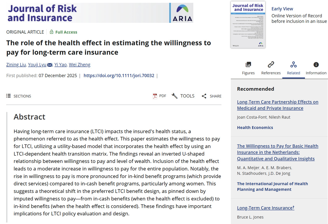 近日,betway88西汉姆联吕有吉副教授,与北京大学经济学院风险管理与保险学系郑伟教授、姚奕副教授和中央财经大学保险学院刘子宁副教授合作的学术论文“The role of the health effect in estimating the willingness to pay for long-term care insurance”被风险管理与保险学领域国际顶级期刊Journal of Risk and Insurance(betway88西汉姆联国际A类期刊)正式接收并在线刊发。
