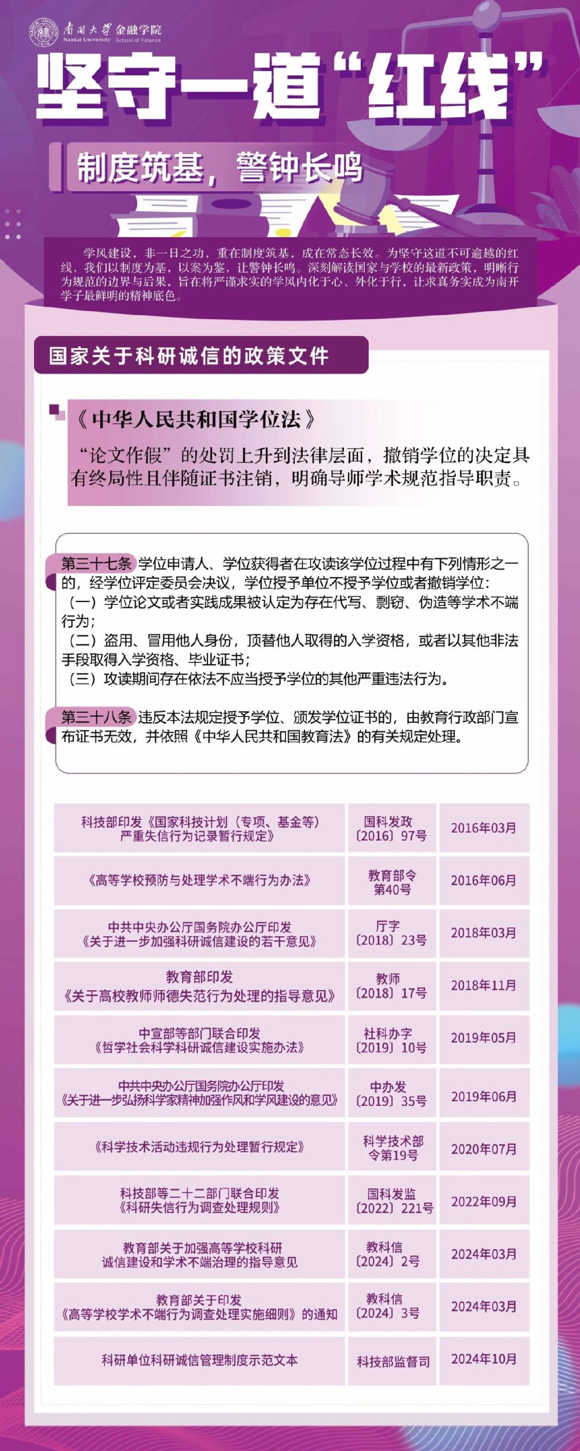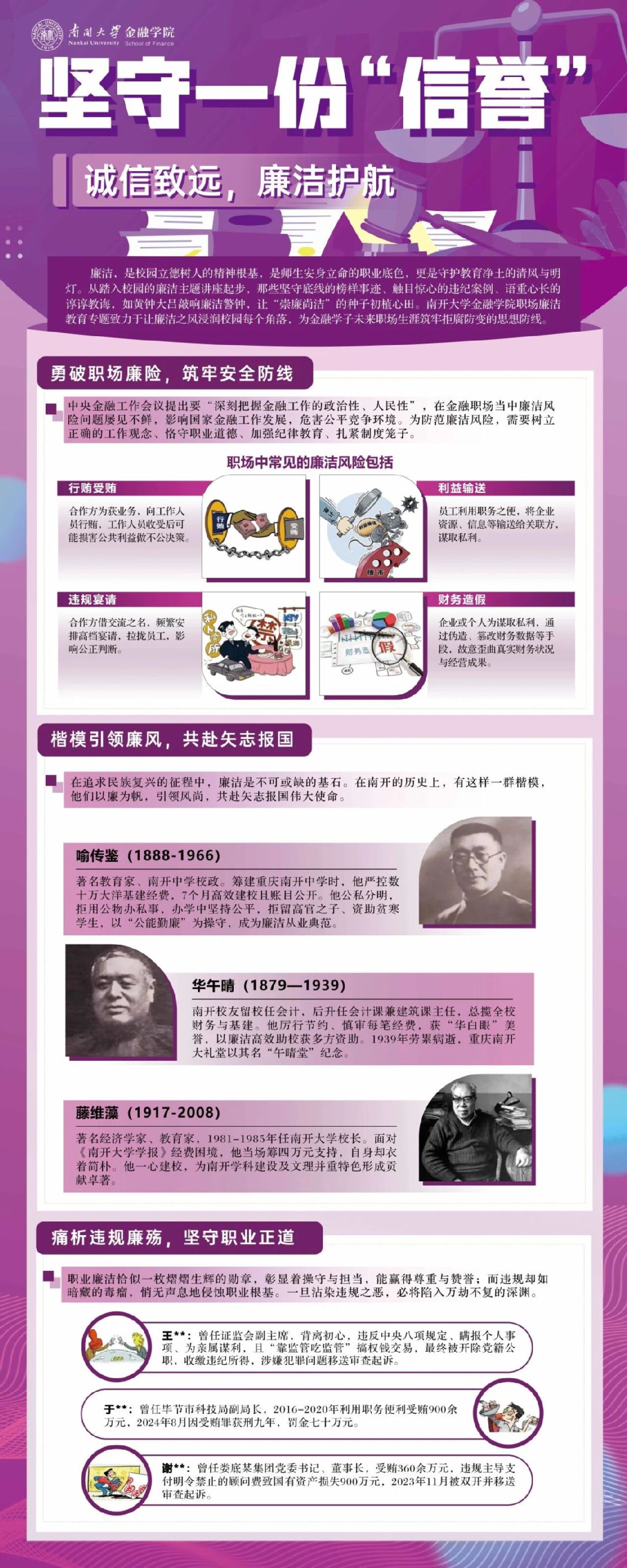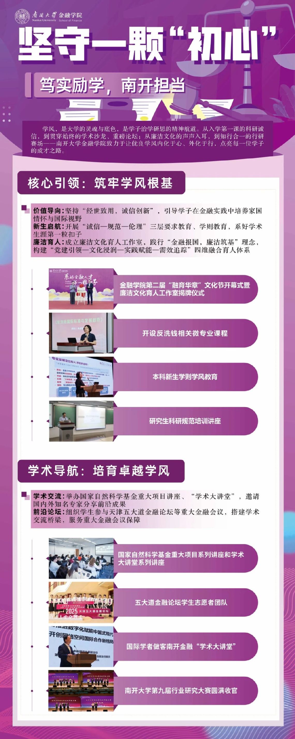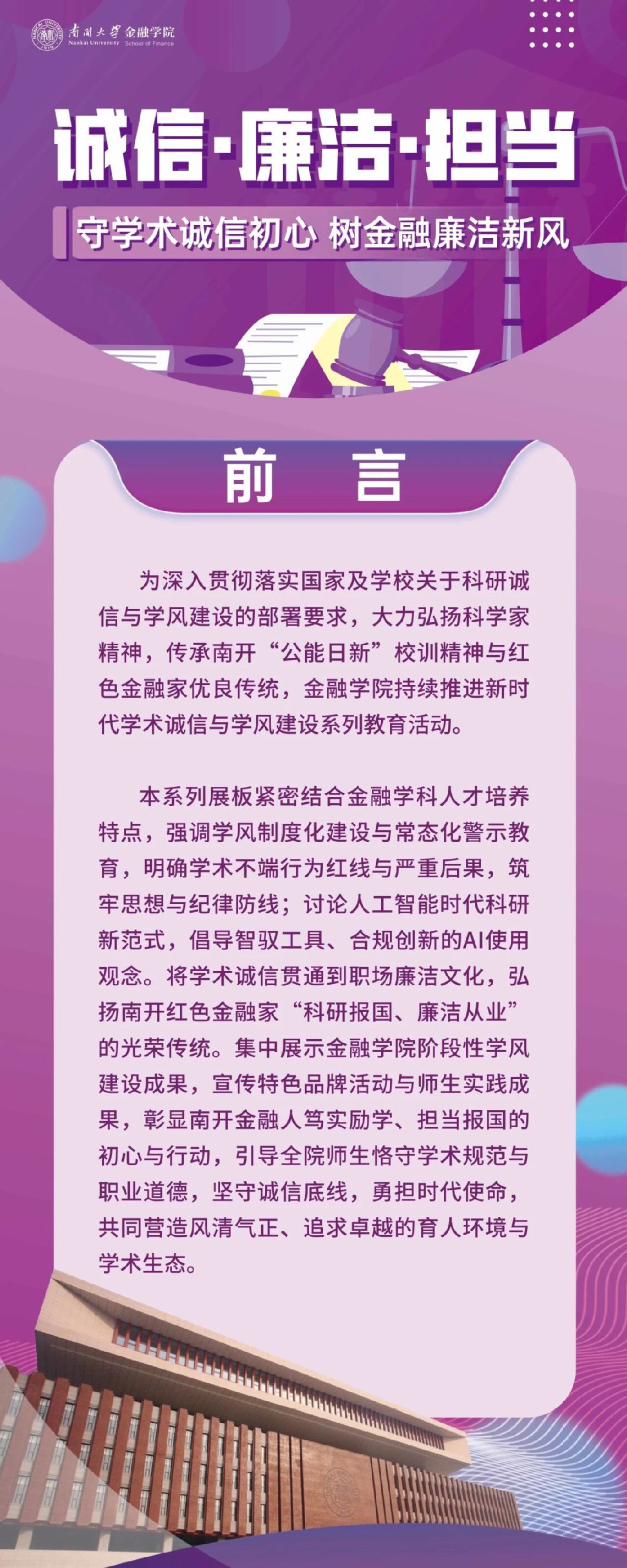 以学风铸魂,以诚信立身。此次展出的学风系列展板,既是学术诚信的警示录,也是金融廉洁的践行指南。诚邀金融betway88西汉姆联全体师生前往学院一楼大厅参观学习,将诚信廉洁刻入心中,把担当使命落到实处,共同营造风清气正的学术生态,筑牢南开金融学风建设的坚实根基!
