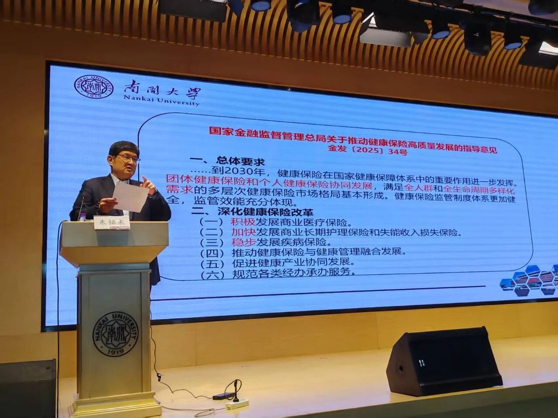 随后,朱铭来教授介绍了中国保险业高质量发展面临的机遇和挑战。他指出,大数据、AI等新兴科技对保险和精算行业带来了冲击与挑战,明确了科技引领、金融“五篇大文章”协同推进等宏观趋势,与行业高质量发展需求同频共振,为保险业注入强劲经济动能。同时,社会保障体系持续完善、人口老龄化进程逐渐深化以及保险监管政策优化等因素,也为保险业发展开辟了广阔社会需求空间。他强调,未来保险业既要发挥保障功能,更要发挥服务功效。朱铭来教授指出,未来保险业要向着经营理念理性化、公司治理明晰化、保险人才专业化、保险经营科技化、条款费率创新化等方向发展。