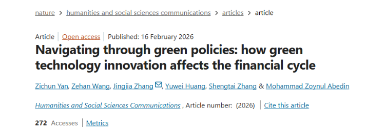 近日,由betway88西汉姆联博士生王则翰(共同一作)、APEC研究中心副研究员张靖佳(通讯作者)与北京邮电大学经济管理学院教授严子淳(公司2015届博士毕业生)等学者合作撰写的论文“Navigating through green policies: how green technology innovation affects the financial cycle”在国际顶级学术期刊Humanities & Social Sciences Communications在线发表。该期刊为Nature旗下唯一面向人文社会科学领域的子刊,在JCR社会科学分区为Q1,中科院人文科学一区。根据Web of Science期刊引用指数,该期刊在人文学科-多学科领域的409种期刊中排名第3,在社会科学跨学科领域的265种期刊中排名第1。