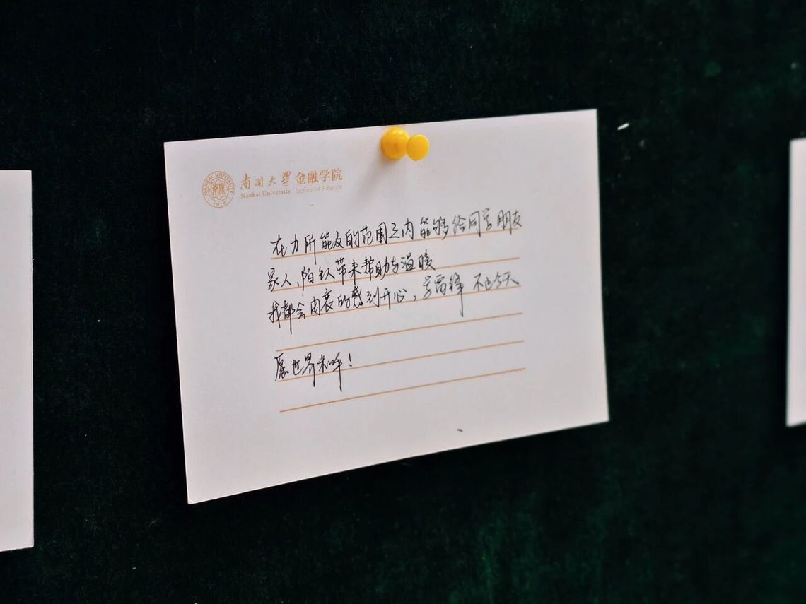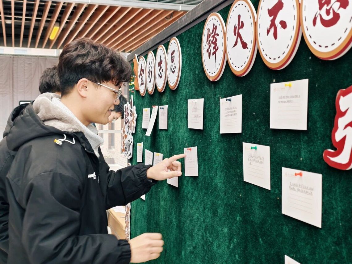 公司大厅的留言板前暖意融融,同学们纷纷提笔分享过往一年的暖心善举,从课堂专业互助、校园节能护绿,到社区金融防诈宣讲、校外财商知识普及,一件件平凡小事化作雷锋精神的生动注脚,让互助奉献的种子在交流分享中生根发芽,让“爱国三问,金融报国”的信念在青年心中筑牢扎根。