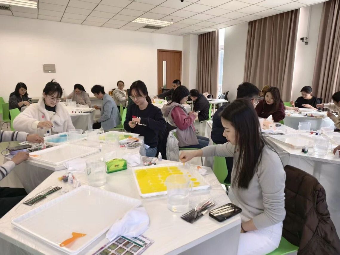 在沉浸式体验环节,女教职工们纷纷化身“非遗创作者”,在指导老师的悉心引导下开启创作之旅。大家手持画针、画梳,将五彩颜料轻轻滴入特制画液中,颜料在水面自然晕染,或形成灵动的波纹,或勾勒出斑斓的花海。大家凝神静气,用工具轻轻拨动水面,描绘出创意图案,再将素白丝巾缓缓覆于水面,轻压、慢提,让水中的斑斓色彩完整拓印于丝巾之上。当一件件兼具古典韵味与个性创意的水拓丝巾作品展现在眼前时,现场满是惊喜与赞叹
